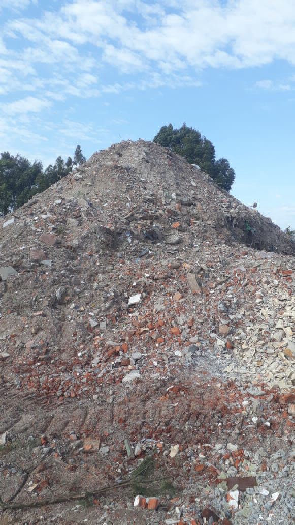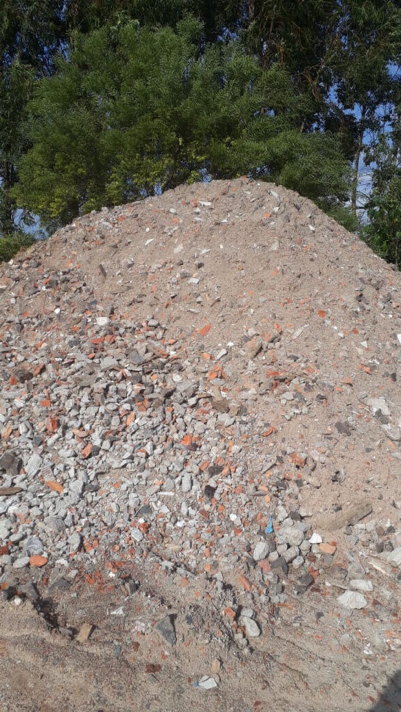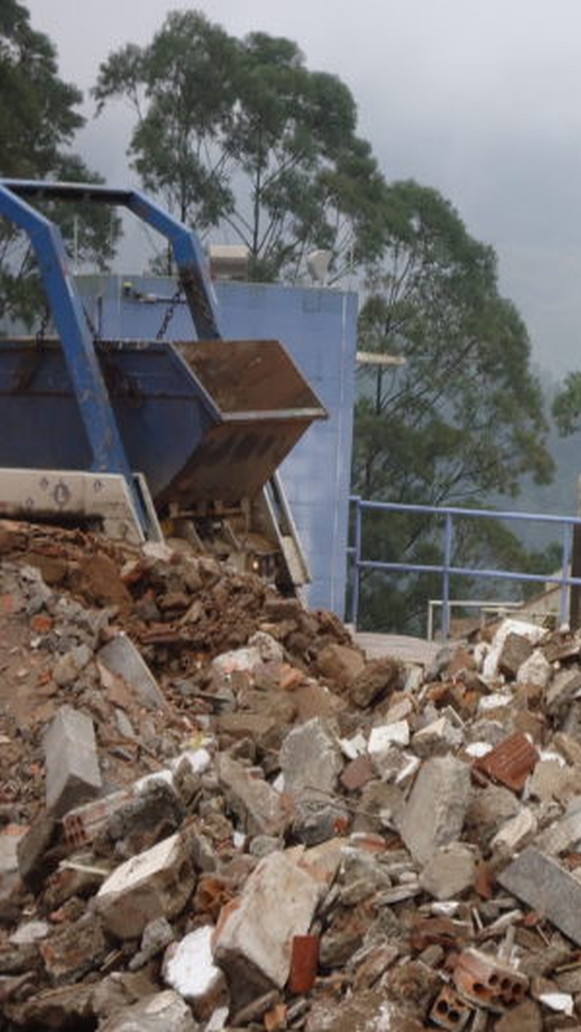 Os cascotes (sobra de tijolos, cimento, areia, etc.) são moídos e transformados em base para pavimentação de aterro.